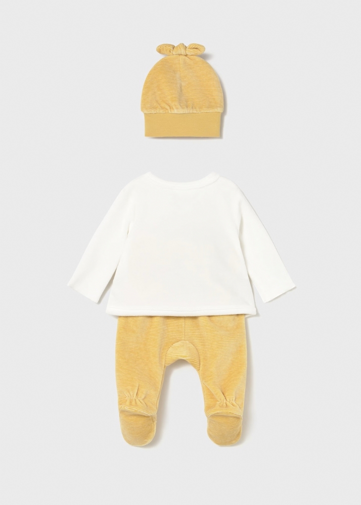 Σετ νεογέννητου με καπελάκι, βελουτέ παντελονάκι με κλειστά πατουσάκια και μπλουζάκι με χαριτωμένο κέντημα νεράιδας.