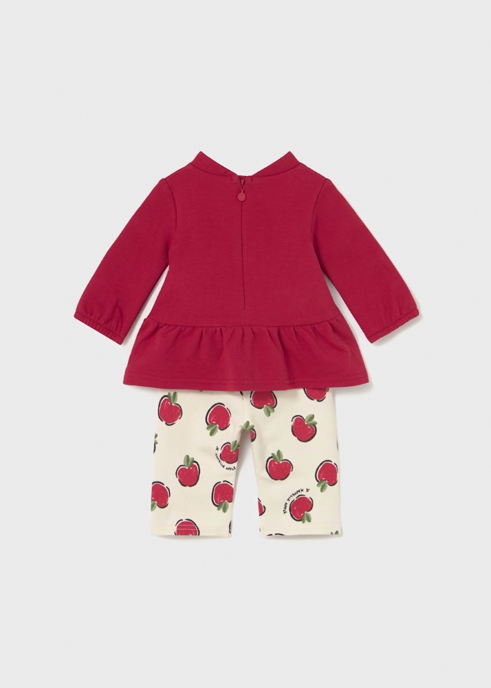 Το σετ περιλαμβάνει μακρυμάνικη μπλούζα με peplum τελείωμα και διακοσμητικό μήλο, καθώς και κολάν με χαριτωμένο μοτίβο μήλων.