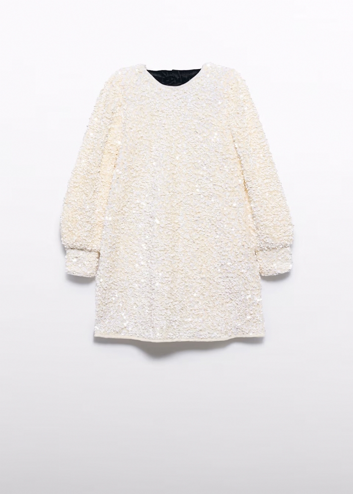 Λαμπερό παιδικό φόρεμα Adel & Lula σε κρεμ απόχρωση, διακοσμημένο με πυκνές πούλιες που χαρίζουν εντυπωσιακή λάμψη σε κάθε κίνηση.