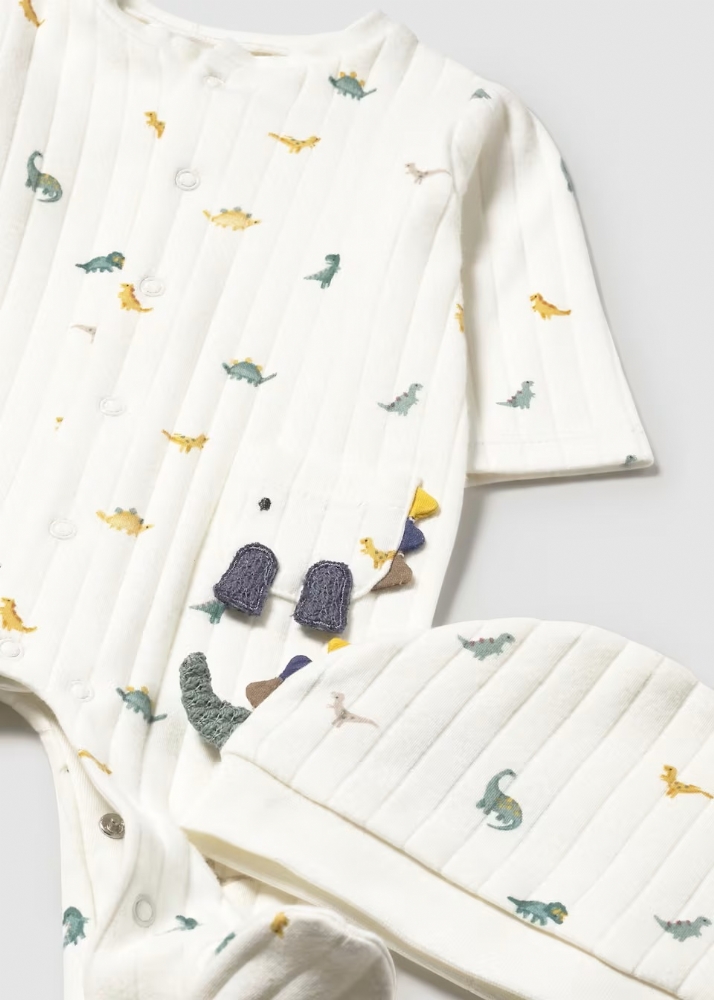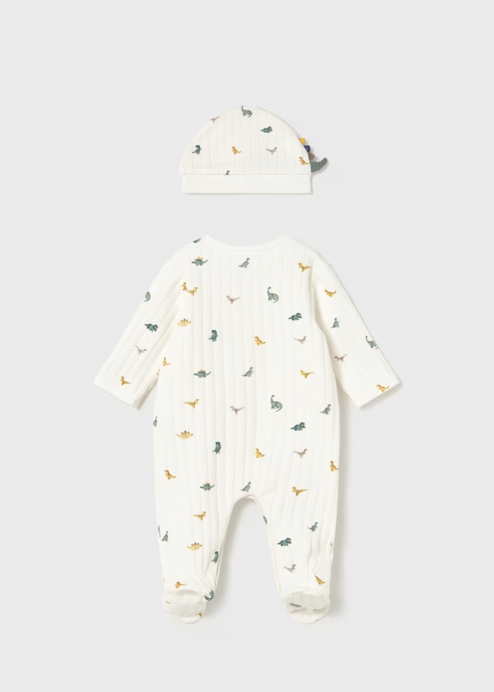 Λατρεμένο βρεφικό σετ Mayoral που περιλαμβάνει ολόσωμο πιτζαμάκι και ασορτί σκουφάκι σε εκρού απόχρωση.